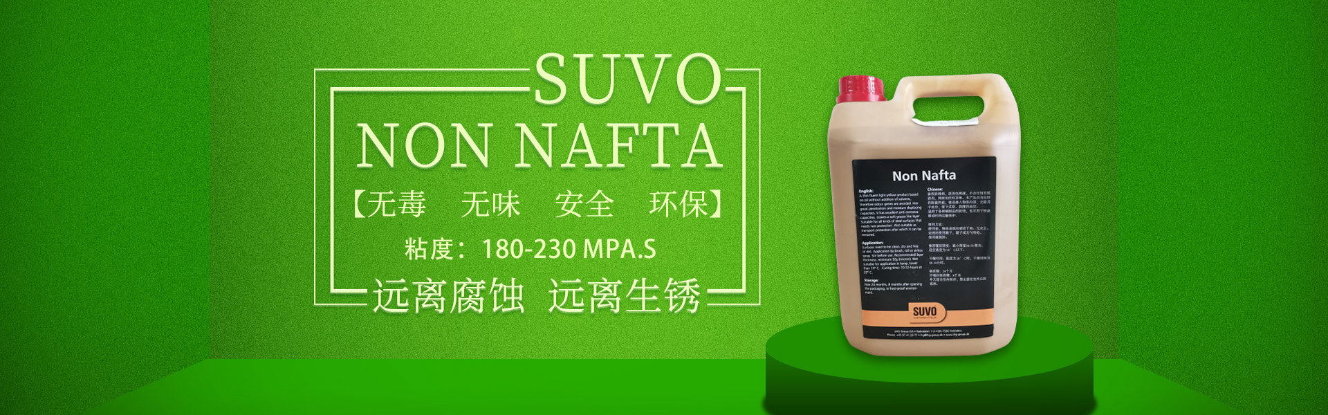 SUVO Non Nafta 是一款無毒、無味、安全、環(huán)保的油基/蠟基防銹產(chǎn)品,不含溶劑,內(nèi)含超強的防腐劑。 涂刷本產(chǎn)品后,會在被保護的工件表面形成一層80-100微米厚的油脂、蠟基保護膜,保護金屬產(chǎn)品免受惡劣環(huán)境侵害,遠離腐蝕,遠離生銹。 產(chǎn)品適合于鋼鐵制品在陸地存儲或海上運輸過程中的長期防腐,防銹。本產(chǎn)品非常易于被石油精/煤油清洗劑清除,清洗過程不損傷工件表面,不污染施工環(huán)境。